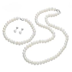 SADA ČERNÝCH SLADKOVODNÍCH PEREL POTATO Černé kultivované sladkovodní perly AA-. Perly jsou od sebe oddělené šperkařskými uzlíky. Náušnice mají zapínání na puzetu. Průměr perel je 7 mm. Délka náhrdelníku je 45 cm, délka náramku je 19 cm. Všechny stříbrné komponenty jsou vyrobené ze stříbra 925/1000 a mají punc ryzosti.